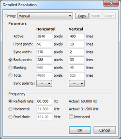 To correctly display games that need both 240p and 480i resolutions, the solution lies in creating a custom superwide 3840x480 modeline, combining it with a shader that scanlines 240p content and interlaces 480i content, and using both through RetroArch, essentially turning your monitor into an extremely sharp CRT TV. On Nvidia cards, the custom modeline can easily be set within your graphics card's drivers. On AMD, it requires the use of third-party software, such as Custom Resolution Utility. Simply add a detailed resolution with the exact settings shown on the picture, restart your computer, and the monitor should now be able to make use of the new modeline. As for the shader, hunterk's interlacing.cg gives you black lines that will oscillate when given an image with 400 or higher vertical resolution, emulating the behavior of 15kHz displays. There are also some shader presets that combine the interlacing shader with tvout-tweaks and image-adjustment for accurate RGB signal emulation and colour controls, and also some that utilize Themaister's NTSC shader for composite/s-video emulation.