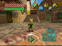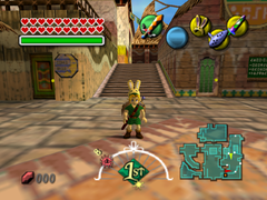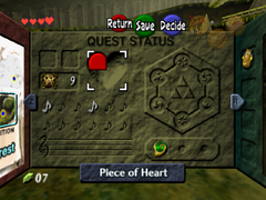 Another issue lies with the appliance of texture filtering per quad on static images, text, and sprites. Because each quad is filtered separately, this can cause some visual inconsistencies. Text and UI elements often look as though their edges cut off abruptly, and static images, such as pre-rendered backgrounds or menu screens, may look as though they are separated into squares (see images below; note how OoT's Quest Status screen appears to be divided into a grid). Some plugins allow the user to turn off texture filtering to remedy this, but, unfortunately, this also applies to textures in the game world, exposing their often low resolutions.