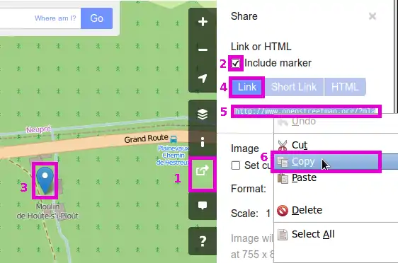 - Click into the URL box directly below the buttons, the URL will get selected automatically (5), copy the URL (e.g. by right click and "copy") (6)