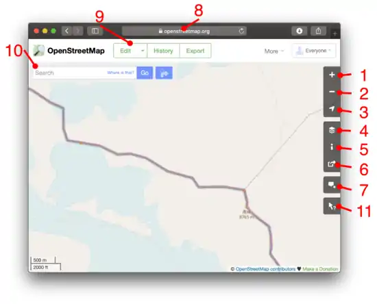 OpenStreetMap supports highly compact short URLs which can be generated from the 'share' panel (6). Short links are great for emailing, tweeting, and otherwise sharing map links in situations where a long URL can cause problems. They redirect to the longer type of the URL described above. Note that these short links are case sensitive and contain I, l and 1. In some fonts these characters can be difficult to distinguish. For more about how the feature works see Shortlink.