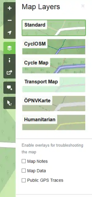 For the “Standard” and “Cycle Map” layers there is a basic key available showing how different types of primitives (mainly roads) on the map are rendered. Click the “i” icon (5) to bring it up. For a more complete key of Standard, see Standard tile layer/Key. For a more complete key of Cycle Map, see .