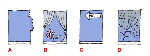 B. Gardinen, Jalousien, Pflanzen, Menschen