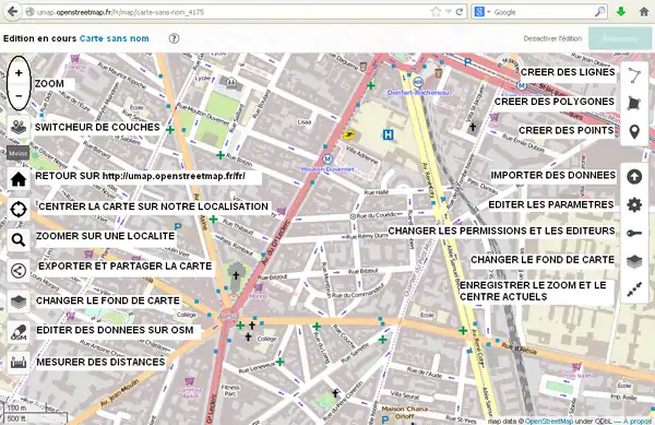 uMap est un logiciel open source sous licence WTFPL qui propose des instances en ligne. Il permet de créer en une minute une carte basée sur OpenStreetMap et de l’afficher dans un site Internet. Vous pouvez créer des cartes personnalisées (voir les exemples à partir de la page d'accueil).