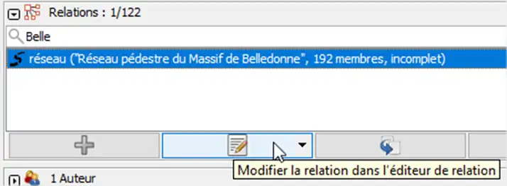 Modifier cette relation pour ajouter les carrefours et les itinéraires. Pour les itinéraires on peut utiliser la recherche de relation et double-cliquer dessus. Pour minimiser le nombre de recherche, on peut chercher un carrefour sur 2.