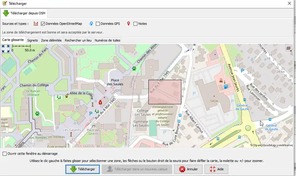 Cliquer sur la carte et maintenir le bouton appuyé pour dessiner le rectangle (bounding box) de la zone à télécharger