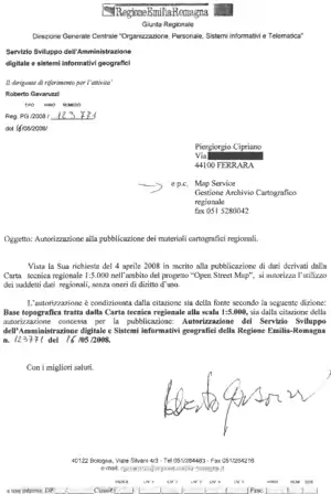 "Vista la Sua richiesta in data 4 aprile 2008 in merito alla pubblicazione di dati derivati dalla Carta tecnica regionale 1:5000 nell'ambito del progetto OpenStreetMap si autorizza l'uso dei suddetti dati regionali, senza oneri di diritto all'uso