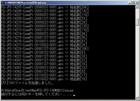 「ConvCommPt.bat」ファイルをダブルクリックしてください。 すると、黒いウインドウが立ち上がり、なにやらいろいろな文字が表示され、 たくさんのTXTファイルとGPXファイルが生成されます。