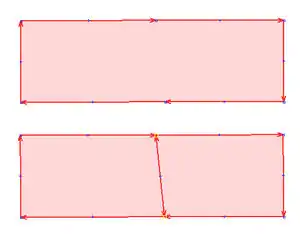 Splits a closed way/area into two closed ways/areas at two selected points or selected way. Properties of the original area are copied to the two new areas. Either select the closed way/area and two child nodes, or select the closed way/area and one way bisecting it.