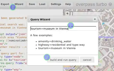 There is a Query Wizard that assists one with the writing of Overpass queries. It is designed to transform simple, human-readable search terms into functional Overpass queries. Here is an example: To get restaurants, now all you have to do is fire up the Wizard and enter Restaurant. Alternatively, one can also type in the appropriate tag amenity=restaurant.
