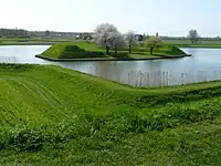 defensive_works moat A  moat that historically provided a fortification with a preliminary line of defence.