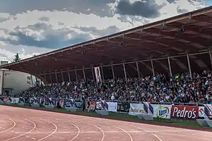 A building=grandstand is the building type for the main stand, usually roofed, commanding the best view for spectators at racecourses or sports grounds. It may have changing rooms or restaurants etc. under the seating area. It can be used within leisure=sports_centre, leisure=stadium or building=stadium to show the location of particular areas of seating.