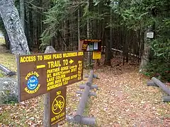 A trailhead is a designated or customary place where people can stop or start a trip on one or more trails or routes. Its position may be marked by a shelter, pole, special design, flag, banner, or parking area. Often there will be a board with a name and a reference to an operator. Parking space will usually be available. Some trailheads are unmarked and known only by word-of-mouth or from information provided on a list or website.