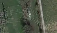A power line leading to a portal mast of a substation. Usually each circuit of a power line gets separated at the last standard mast and then leads to a different portal.