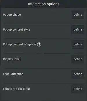 Information about a shape (marker, line, polygon) can be shown in various ways: labels, pop-ups, sidebar,.... This article is about the configuration of this information: what will be shown, how is it displayed and when is it displayed.