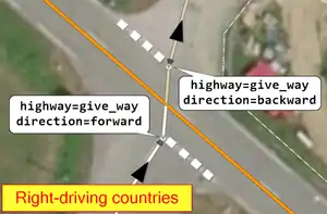 - Follow the black arrows, add direction=forward if the driver can see the give way sign and must give way, else add direction=backward if the driver can not see the sign and must not give way.