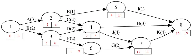 • Total float: This is greatest amount of time we can wait before starting the activity and getting it finished before the next activity must start. Node 6 indicates the latest time the node can be left is 9, so our activity must be finished by then. Node 3 indicates we could start the activity as early as 2, the duration of the activity is 2, so in the space of (9-2)=7 units of time, the activity must be done, which takes 2 units of time, leaving 5 units of time, this is the total float