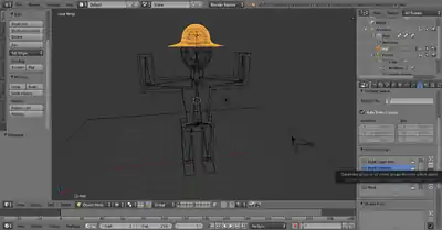 Noob Note: If you've been adding bones to your simple person from the previous lessons, you will have likely noticed that the hat seems to stretch when you move the arms in pose mode. To fix this, you will need to remove the hat from the forearm vertex groups created in the Parenting step.