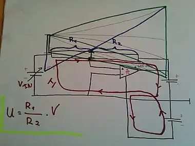 If we have voltages with different polarity and VIN1 and VIN2 are selected so that VOUT=0 (point known as "virtual ground") we have a comparing device,like in the scheme in the third picture:VIN2/VIN1 = -(r2/r1).To keep Vout = 0 we can use operational amplifier(down).Here I1.R1=(VIN/R1).R2 or VOUT/VIN=-R2/R1.