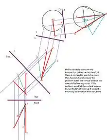 If the axes of the cones are not segments, but infinitely long lines, it is necessary to test if there are more two solutions. The rotating line that creates the conic surface can point in different directions from the vertex, creating a possibility of two cones. Because of this, there can be a maximum of four loci intersections for four cones.