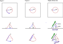 A locus(loci) is a solution(s) that satisfy a given set of conditions. [[[[Media:|thumbnail]]]] Depending on the situation, the locus can be a different solution. In Figure A, there is a vertical axis BO and a point a. When point a is revolved around BO, the path that point a creates is a circle. In this given set of conditions, the locus is the circular path that point a creates when revolved around BO because that circle is a collection of all the points that are the same distance from BO as point a. In Figure B, there is a vertical axis BO with a line segment AO touches BO to creates ∠AOB. When AO is revolved around BO, the path that the AO creates a surface that takes the shape of a cone. Therefore, in this particular set of conditions, the locus AO is a conical surface because that surface is a collection of all the line segments that can be represented by AO in a three-dimensional space.