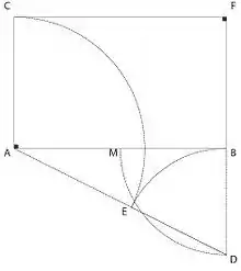 3. Label the midpoint of AE with point M and draw a construction line between points M and D. Draw an arc from point M to connect the line perpendicular to AC. Label that point with B