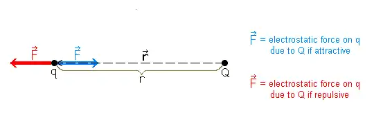 Any force on an object is a vector quantity. Vector quantities such as forces are characterized by a numerical magnitude (i. e. basically the size of the force) and a direction. A vector is often pictured by an arrow pointing in the direction. In a force vector, the direction is the one in which the force pulls the object. The symbol is used here for the electric force vector. If charges q and Q are either both positive or both negative, then they will repel each other. This means the direction of the electric force on q due to Q is away from Q in exactly the opposite direction, as shown by the red arrow in the preceding diagram. If one of the charges is positive and the other negative, then they will attract each other. This means that the direction of on q due to Q is exactly in the direction towards Q, as shown by the blue arrow in the preceding diagram. The Coulomb's equation shown above will give a magnitude for a repulsive force away from the Q charge. A property of a vector is that if its magnitude is negative, the vector will be equal to a vector with an equivalent but positive magnitude and exactly the opposite direction. So, if the magnitude given by the above equation is negative due to opposite charges, the direction of the resulting force will be directly opposite of away from Q, meaning the force will be towards Q, an attractive force. In other sources, different variations of Coulombs' Law are given, including vector formulas in some cases (see Wikipedia link and reference(s) below).