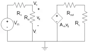 The model for the op-amp is shown in Figure 1. Where V+ − V− is equal to vd; Rin is the input impedance; Rout is the output impedance; Avo is the open loop gain; and Rs is the source impedance.
