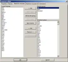 When editing a DNA sequence, two tabs with settings for restriction enzymes are available. The first one is identical to the enzyme management dialog. The second one is identical to the global enzyme settings tab, but contains the settings for this sequence alone. By default, its options are disabled, and the global options are used. By activation the options here, global settings are overridden.