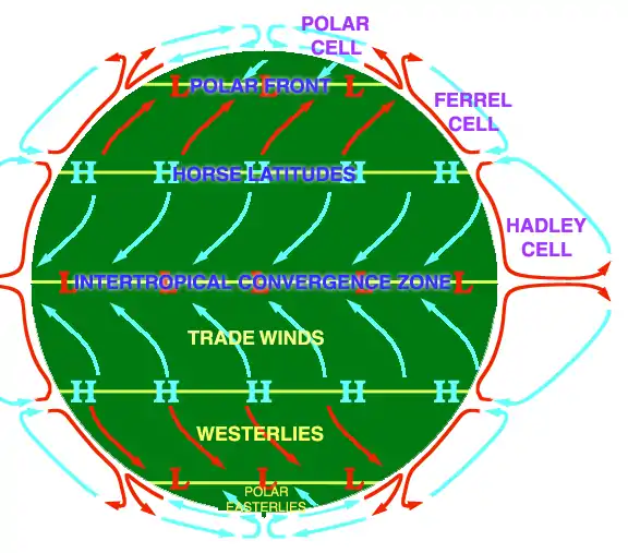 Let's look at the global wind belts at the Earth's surface in the Northern Hemisphere. In the Hadley cell, air moves north to south, but is deflected to the right by the Coriolis Effect. These winds therefore blow from the northeast to the southwest. They are called the trade winds because at the time of sailing ships they were good for trade. Winds in the Ferrel cell blow from the southwest and are called the westerly winds or westerlies. The westerlies are the reason a flight across the United States from San Francisco to New York City takes less time than the reverse trip. On the outbound flight, the airplane is being pushed along by the westerlies, but on the reverse trip the airplane must fight against the air currents. In the Polar cell, the winds travel from the northeast and are called the polar easterlies. These names hold for the winds in the wind belts of the Southern Hemisphere as well.