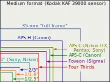 In the analog era, it was common to express formats in terms of the physical size of the recording medium, for example 4×3 inches. These days it is more common to express the format in terms of the accepted short form for the standardized sensor size. For example '35mm' or 'APS-C'.