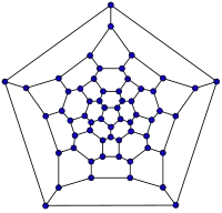 The smallest fullerene is the w:dodecahedron--the unique C20. There are no fullerenes with 22 vertices.[18] The number of fullerenes C2n grows with increasing n = 12,13,14..., roughly in proportion to n9. For instance, there are 1812 non-isomorphic fullerenes C60. Note that only one form of C60, the buckminsterfullerene alias w:truncated icosahedron, has no pair of adjacent pentagons (the smallest such fullerene). To further illustrate the growth, there are 214,127,713 non-isomorphic fullerenes C200, 15,655,672 of which have no adjacent pentagons.