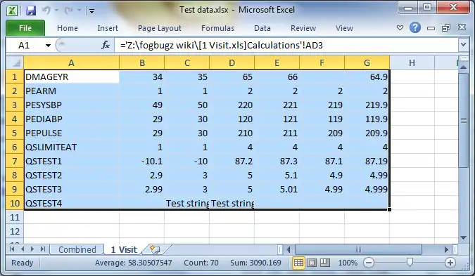 Finally: When saving, please select the Combined sheet to be topmost. The Test Data workbook should now update as the CRFs updates.