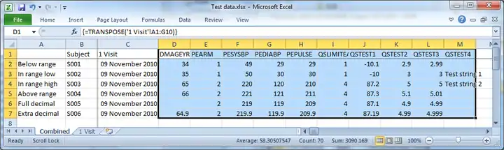 Word merge only takes a single, wide spreadsheet as input, so you may need to combine test data from the individual CRF workbooks. In this spreadsheet, data is collected as vertical columns, then transposed to rows for the Word merge.