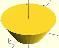 equivalent scripts cylinder(h=15, r1=9.5, r2=19.5, center=false); cylinder( 15, 9.5, 19.5, false); cylinder( 15, 9.5, 19.5); cylinder( 15, 9.5, d2=39 ); cylinder( 15, d1=19, d2=39 ); cylinder( 15, d1=19, r2=19.5);