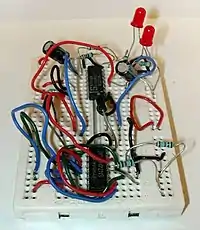 The breadboard (also called a protoboard) is used to create circuits without soldering components together. The pins are connected vertically along the grey and red lines and horizontally in the sections in between. Note that they do not connect across the gap in the center.