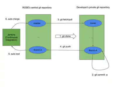 The ROSE project uses a workflow that automates the central principles of continuous integration in order to make integrating the work from different developers a non-event. Because the integration process only integrates with ROSE the changes that passes all tests we encourage all developers to stay in sync with the latest version.