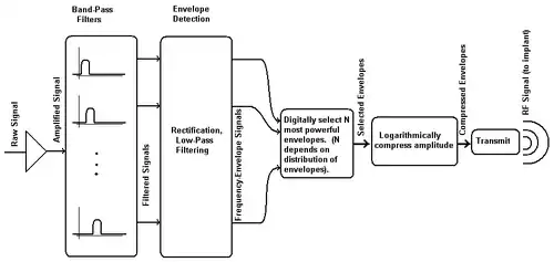 These generally involve applying a non-linear gain on the sound (as an input audio signal with a ~30dB dynamic range must be compressed into an electrical signal with just a ~5dB dynamic range), and passing it through parallel filter banks. The first waveform strategy to be tried was Compressed Analog approach. In this system, the raw audio is initially filtered with a gain-controlled amplifier (the gain-control reduces the dynamic range of the signal). The signal is then passed through parallel band-pass filters, and the output of these filters goes on to stimulate electrodes at their appropriate locations.