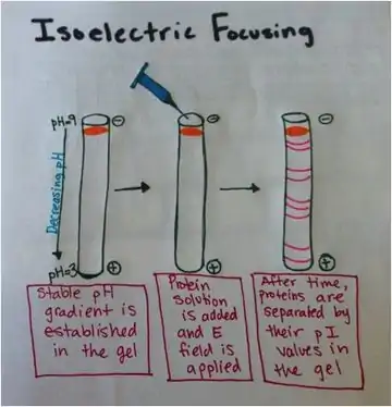 Isoelectric Focusing is an electrophoresis protein purification process in which proteins are separated by their isoelectric points. The isoelectric point of a protein, the pI, is the characteristic pH at which a protein carries no net charge. The net charge of a protein is determined by the acidity or basicity of the side chains that make up the protein. If a protein has more acidic groups than basic groups then the protein will have a very low pH and be considered acidic. If the protein has more basic groups in its side chains than acidic groups then the overall charge of the protein will cause its pH to be much higher. Isoelectric focusing takes advantage of these properties with the following steps: