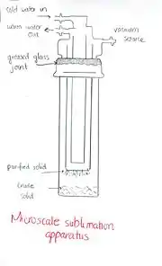 The apparatus for sublimation consists of an outer vessel and an inner vessel. The outer vessel holds the sample to be purified connected to a vacuum. The inner container known as a cold finger provides a cold surface on which the vaporized compound can recondense as a solid. To perform sublimation, the sample to be sublimed must be placed into a filter flask. Next, an inner tube is placed in the flask and the vacuum is turned on. Afterwards, the sublimation flask is heated gently, using a sand bath, as ice is filled in the inner tube. During sublimation, material will disappear from the bottom of the outer vessel and then reappear on the cool, outside surface of the inner test tube. This is the result of the compound vaporizing as it reaches its sublimation temperature and then recondensing on the cold finger as a result of cooling. After completion, the inner test tube can be removed and the pure solid can be scraped off and analyzed.