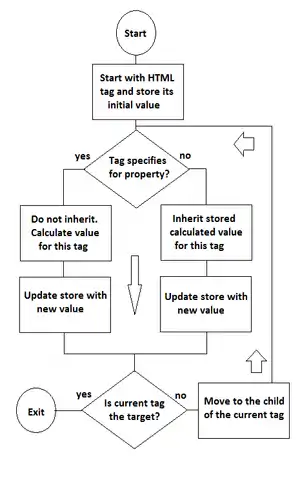 With such a model either the cascaded, inherited, or initial values will be assigned during any one iteration of the loop. In a practical situation there would not be a single run but several, not just to the deepest target, but including all of the side runs also. Nor would there be just one CSS property that is of interest, but rather all of the properties that can apply to that element. The scenario that perhaps serves best to understand the scope of what is done, is to imagine dozens of properties being considered at the same time at every iteration, then several more passes to get the rest.