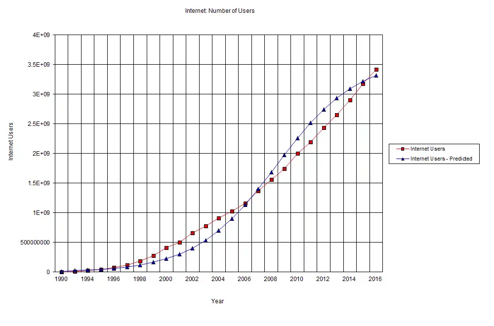 The values used for the real values of internet adoption are taken from World Bank Data which acquired this data from the ICT Development Report by the International Telecommunication Union[4]. The data acquired was in the form of a yearly percentage figure which was then multiplied by yearly world population statistics acquired from Worldometers.info which elaborated on data by the United Nations, Department of Economic and and Social Affairs, Population Division. All the data was then rounded using Excel's Integer Function to reach a result that would reflect real world populations (as the number of humans can only be a whole number).
