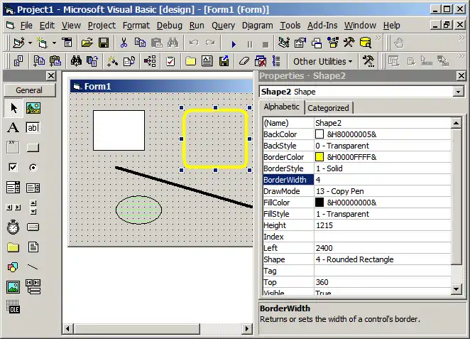 Here is a simple example showing some of the shapes that can be created simply by dropping Shape controls on a Form: