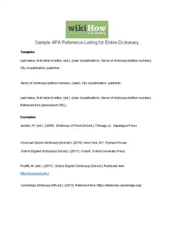 2Write the last name and first initials of the editors. The last name always goes first in an APA citation. Separate a list of names with commas and place an “&” before the last name. In parentheses after the name, write “ed.” to signify that this is the editor of the dictionary.[16]