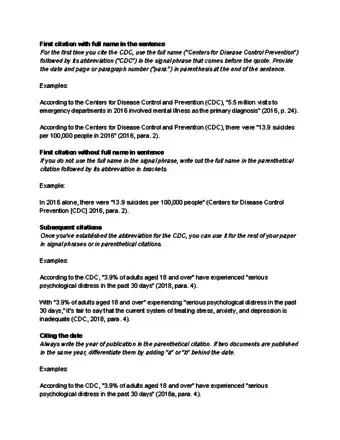 Include the full name of the CDC and its abbreviation in the sentence introducing the quotation. For the first citation, if you use the full name of the Centers for Disease and Control Prevention in the signal phrase preceding the quotation, you can follow it immediately with the abbreviation in parentheses. Then, for each subsequent citation, you can simply use the abbreviation. In this case, you’ll only include the date and the page number in the in-text citation. In the absence of a page number (in the case of web articles, for instance), you can list the paragraph number (“para.”) followed by the paragraph number. For example:[4]