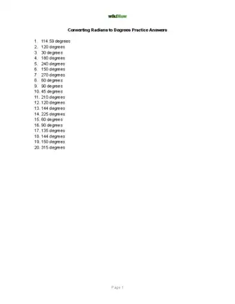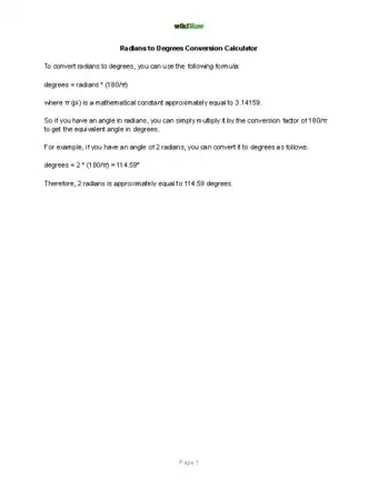 Radians and degrees are both units that you can use to measure an angle. Converting radians to degrees is pretty easy. First, remember that π radians is equal to 180 degrees, or half the number of degrees in a circle. That means that 1 radian is equal to 180 degrees divided by π. So, in order to convert radians to degrees, all you have to do is multiply the number of radians by 180 divided by π. For instance, let’s say you have to convert 1/2 π radians into degrees. Simply multiply π/2 by 180/ π to get 90 degrees. Be careful though, because while radians are usually written as multiples of π, this isn’t always the case. When you’re solving a problem where you have to convert radians to degrees, look at the numbers closely. Make sure, for example, that you don’t mix up 2 π radians with 2 radians. 2 π radians equals 360 degrees, or the number of degrees in a circle. However, 2 radians is equal to only about 114.6 degrees. For more examples of converting radians to degrees, read on!