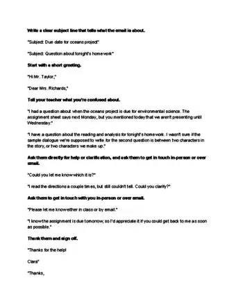 4Be straightforward. Teachers have a limited amount of time per day to answer your questions, so make your email quick and to-the-point:[4]