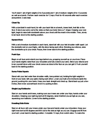 Do elbow squeezes. This is a simple exercise that works out the chest muscles. You will need dumbbells again for this exercise.