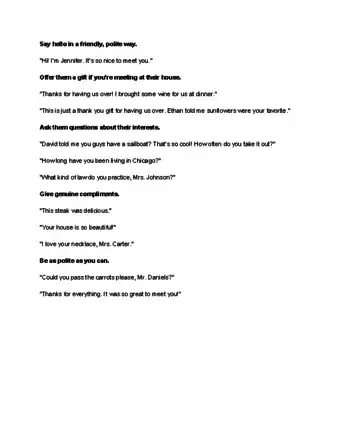 4Be polite. Practice good manners when you are around his parents. Say "please" and "thank you." Do not interrupt when someone else is talking. Give genuine compliments.[11] If you like the food that was prepared or his mom's earrings, say so.[12]