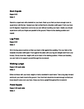 - Do lunges to work on your quadriceps. Stand upright with your hands on your hips. Take a big step forward with your left foot, and lower your body toward the floor until your left leg is bent at a right angle. Your back knee will lower until it is nearly touching the floor. Repeat this exercise several times, then switch to the other side.