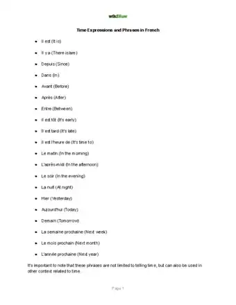 Pick up words and phrases for time concepts. If someone tells you the time when you ask, you can simply say "merci" and be on your way, but you might want to comment on the time in some way. The following words and phrases help you put the time in context:[17]